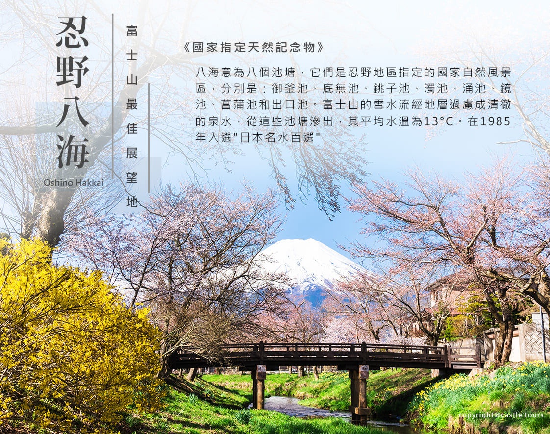 富士山著名景點忍野八海位於日本山梨縣忍野村,地處河口湖與山中湖之間,富士山的融雪滲透到地下,經過長年的地層過濾,由山麓附近的忍野村的地下涌出,形成了出口池、御釜池、底拔池、銚子池、湧池、濁池、鏡池、菖蒲池等八個泉水池,人稱“忍野八海”。忍野八海中湧池位於忍野八海的景點中心位置,水深4米,池水清澈見底。附近有茅草屋式的旅遊購物餐飲設施,大水車和磨坊,構成了一片田原景色。由忍野八海眺望富士山的景致亦別有特色,夏日的浮雲,冬日的晨曦,拍出來美不勝收。忍野八海的富士山湧水水質極好,景區內有專供取水的泉口,買個塑料瓶可裝水帶回家飲用。忍野八海2013年6月與富士山一起登記為世界文化遺產。忍野八海還被指定為日本天然記念物,並入選了日本名水百選,是新富岳百景之一。【註:八池並非全部開放參觀,敬請諒解!】