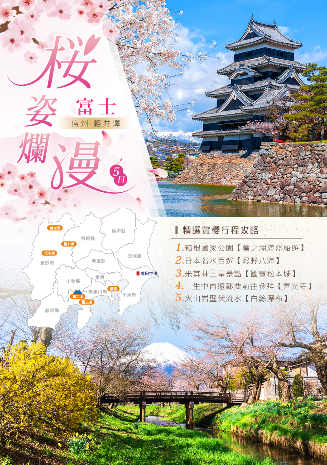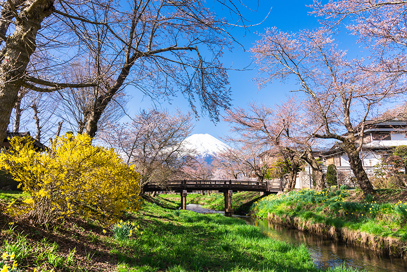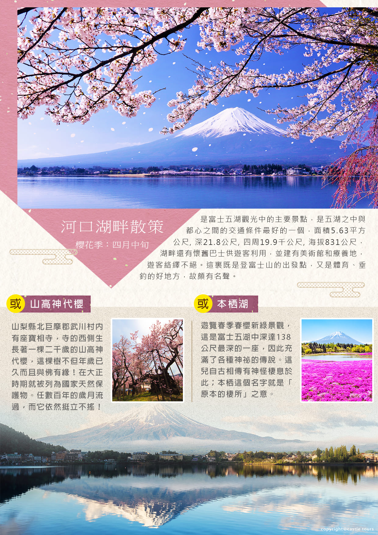 遊覽春季春櫻新綠景觀,這是富士五湖中深達138公尺最深的一座,因此充滿了各種神祕的傳說。這兒自古相傳有神怪棲息於此;本栖這個名字就是「原本的棲所」之意。此外本栖湖也是富士五湖中唯一的不凍湖,即使是冬天,湖水溫度也不會低過攝氏4度,另一引人注目之處是,日幣千圓紙鈔上的圖案,正是此地的日出,足見此地日出之美。同時每年四月底至五月底湖畔70萬株的芝櫻盛開,更將此地彩繪的美麗異常。