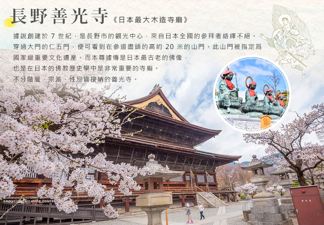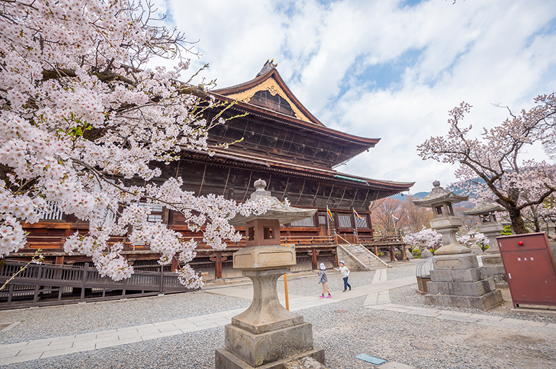 據說創建於 7 世紀,是長野市的觀光中心,來自日本全國的參拜者絡繹不絕。穿過大門的仁五門,便可看到在參道盡頭的高約 20 米的山門。此山門被指定爲國家級重要文化遺産。本堂的用絲柏樹皮葺頂的屋頂呈雙重結構,其正面挂的“善光寺”三個字的筆畫是以鴿子模樣寫成的,其聲名遠播。山門深處的本堂被指定為國寶,是重建於 1707 年的規模屬日本第三的木結構建築物。