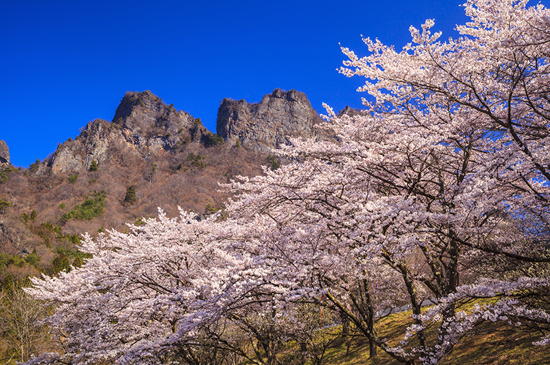 妙義山是代表群馬縣的上毛三山(赤城山,榛名山)之一。由於陡峭的斜坡與奇岩怪石的外形,而被列位日本三大奇勝之一。妙義山東面有一座歷史悠久,具有傳統建築格式的「妙義神社」,創建於1500年前,爬完了階梯山路,即可看到莊嚴雄偉的正殿。同時,妙義山的春天也是很有魅力的。在其山腳有一整片櫻花公園,從4月下旬到5月上旬,有50個種類,一千五百棵以上的櫻花盛開。每年的5月3日還開辦櫻花祭,建議大家一定要來看看。