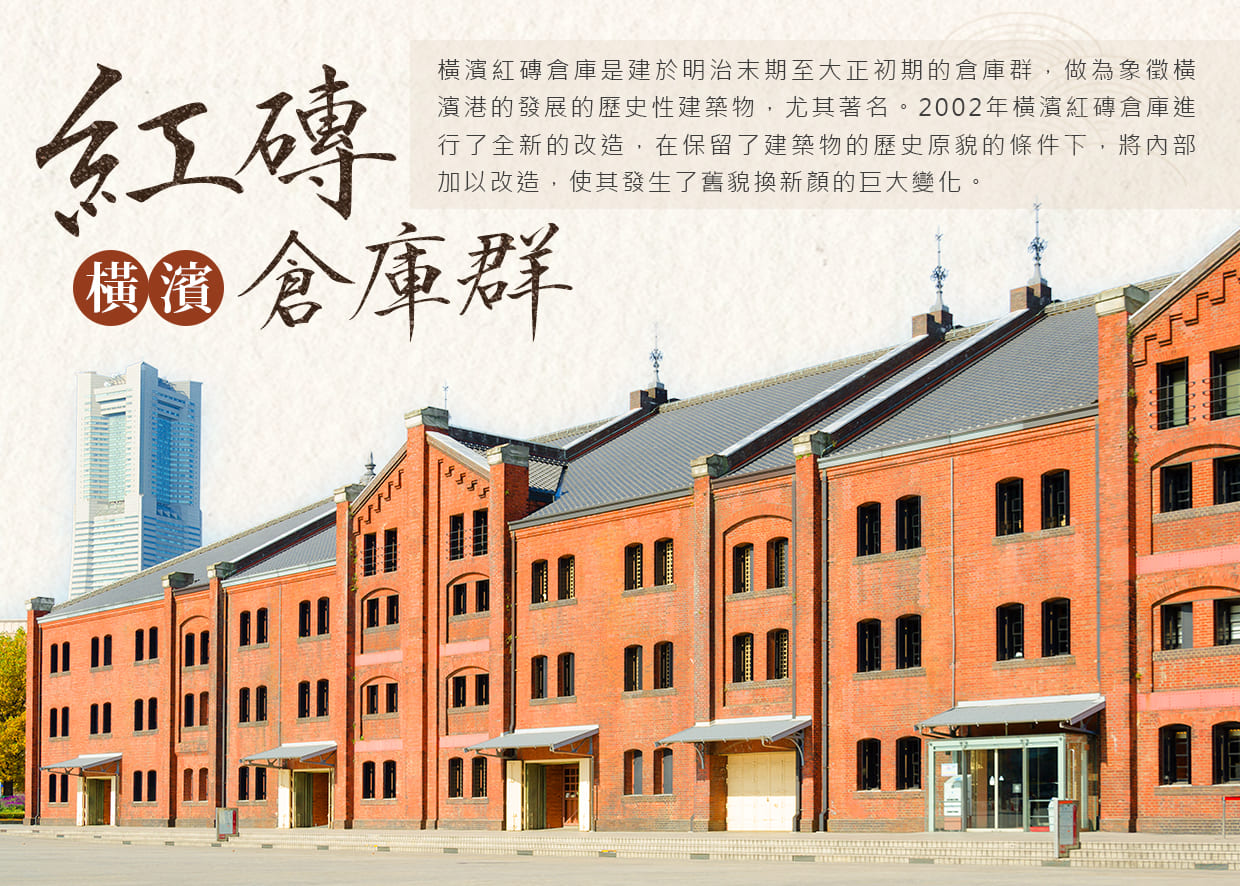 橫濱紅磚倉庫是建於明治末期至大正初期的倉庫群,做為象徵橫濱港的發展的歷史性建築物,尤其著名。2002年橫濱紅磚倉庫進行了全新的改造,在保留了建築物的歷史原貌的條件下,將內部加以改造,使其發生了舊貌換新顏的巨大變化。改造後的横濱紅磚倉庫1号館做為文化展設施,紅磚倉庫2号館則改造成為以時裝店、雑貨店和美食店為主的商業購物設施,為橫濱增加了極富魅力的旅遊購物設施。橫濱紅磚倉庫附近一帯的廣場空地和公園構成了橫濱紅磚倉庫景區,成為橫濱旅遊的一個熱點。尤其是黃昏後的燈飾效果極有效果,是横濱著名夜景之一。由橫濱紅磚倉庫的空地眺望橫濱灣的山下公園一帶,或從横濱紅磚倉庫眺望相反方向的港未來21地區的夜景極為美麗。