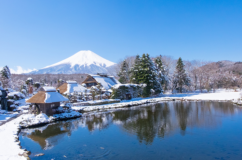 被譽為日本首屈一指的美麗之鄉『西湖根場~合掌村』,因德國建築學家的一本《日本美的再發現》開始聲名大噪。在此眺望遠方的富士山,彷彿近在咫尺。多棟屋舍用特殊的稻草編織起層層屋頂,特徵是兩邊的屋頂像是一本打開的書一樣、成一個三角形狀,可以減少受風力,且調節每日日照量,使得屋內得以冬暖夏涼,更適合人居住。合掌屋(當地稱為合掌造)整棟建築皆以卡榫、結繩等方式建成,不用一根鐵釘,外型猶如雙手朝天合掌狀的合掌屋,屋頂呈現的60度角,是為了讓冬季的降雪可以自動彈落。合掌屋是日本最著名的傳統建築之一,傳說這種建築形式是13世紀初平氏家族在源平合戰戰敗後遁入深山,為了禦寒並躲避追兵而建造的。目前保存下來的建築物大約是在江戶時代中後期興建的,對日本人而言則是古代日本人對抗大自然的精神象徵。古樸的造形,仍能屹立百年而不搖,實為日本傳統建築珍寶,1995年被聯合國列為世界遺產。在每棟建築物中,除了有傳統工藝的體驗外,還有資料館、美食館等可以遊覽參觀,部份展館需附費,請自行斟酌考量;悠然漫步期間,就像走進時光隧道,回到末代武士電影場景中的年代。