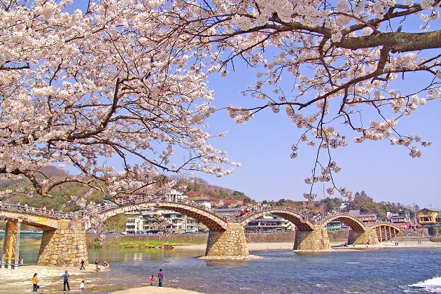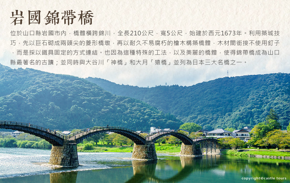 錦帶橋位於山口縣岩國市,錦帶橋是聞名日本的三大奇橋之一,橫跨於山口縣境內的第一大河--錦川。橋身長約210公尺、寬5公尺、高6.6公尺,早在1673年,第三代岩國藩藩主吉川廣嘉所建造時,就全橋使用木製材料,並採用複雜的組合式建造技法,完全沒使用一根釘子。不過由於颱風來襲,錦川洪水暴漲兩度沖毀橋身,後來看到的錦帶橋是市民合力修復的成果。現在錦帶橋的基樁改用石頭,而橋身仍是保持木製材料。錦帶橋五連的拱橋造型,就像是綿延的錦帶,不難發現其匠工之精細,構造之複雜。無論是白天或是夜晚,橋身倒映在粼粼的水面上,伴隨沿岸櫻花及相望的岩國城,不同角度和時間都有不同的風味。
