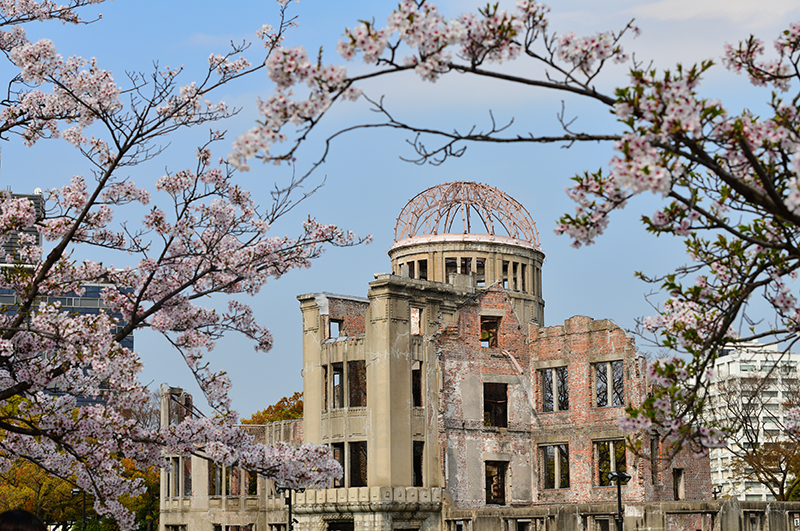 西元一九四五年八月六日,美軍在廣島投下第一顆原子彈,在廣島市死傷了十幾萬人,市街大部分燒毀,戰後重新整建,日人為了紀念原爆的死者,於1955年在原爆中心點所建立,為死者祈福;而原爆圓頂館崩塌半毀的外壁,只剩鋼筋鐵架的圓形屋頂,自從被炸至今,一直原封不動的保存著;館舍建於大正四年,原是廣島縣的產業獎勵館,當年只因它位在一座T字形「相生橋」在左方,遂成為盟軍投擲原子彈的目標。
