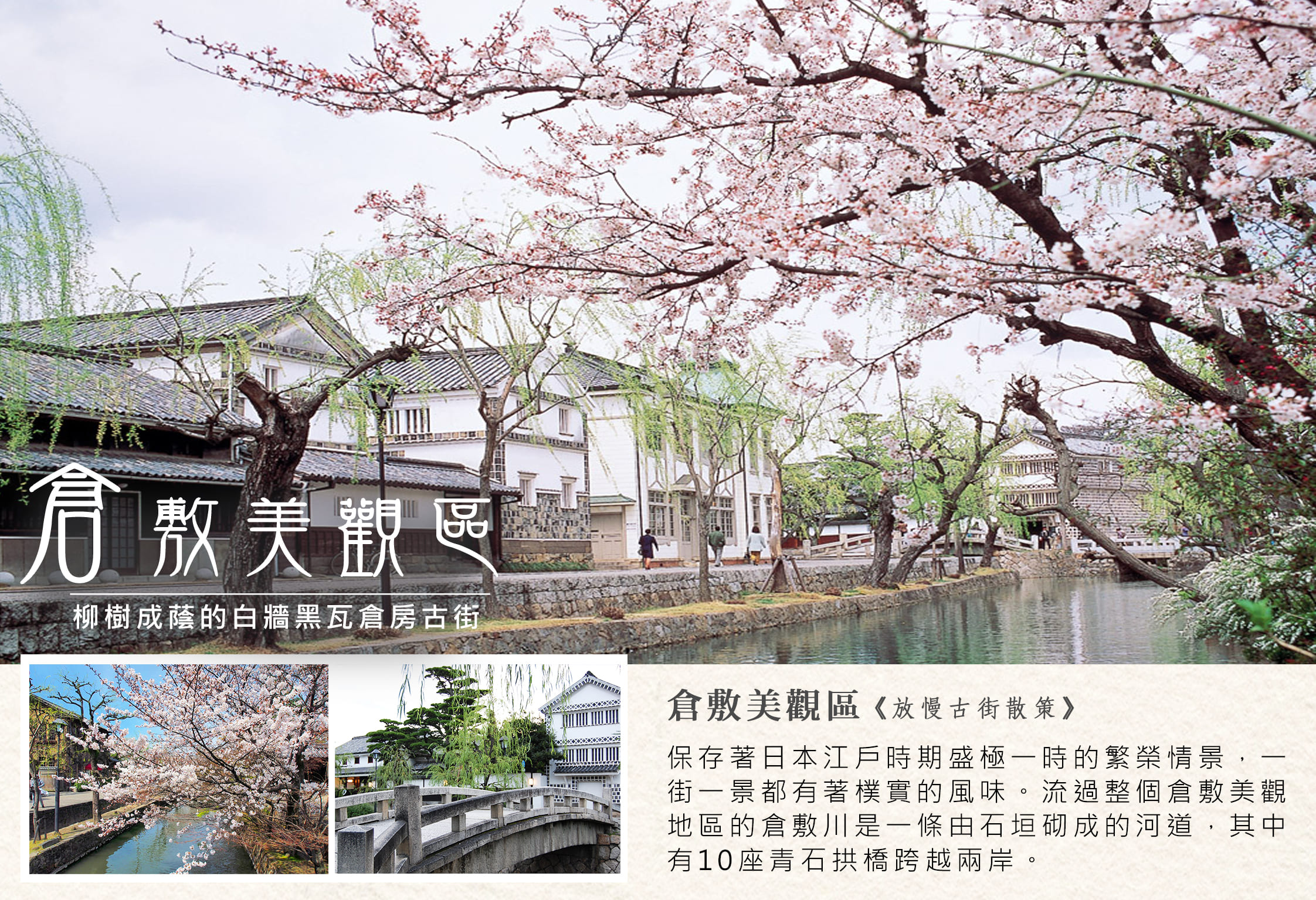 尚保存著日本江戶時期直轄地盛極一時的繁榮情景,一街一景都有著樸實的風味。流過整個倉敷美觀地區的倉敷川是1條由石垣砌成的河道,其中有10座青石拱橋跨越兩岸。兩岸儘是看不盡的楊柳與櫻花。漫步在古意盎然的純樸街道中,沿途可以欣賞商人們用於貯存貨物的白色牆壁的倉庫,至今尚保存著的貨場、大八車(過去運送物資的車)通行的石板路、相當於古時的路燈的常明燈等等,反映出當時的繁榮景象。19世紀下半葉,倉敷的商人開始積極吸收西洋文化,被視為倉敷文化象徵、擁有希臘風格的大原美術館就建於1930年。因為倉敷美觀地區保存狀態良好的日本江戶時期的宅戶、商店及倉庫等各有特色的優美建築呈現出江戶時期的日本風情,極富詩情畫意,因此人稱「美觀地區」,也使得這個地區被指定為「重要傳統建造物群保存地區」。