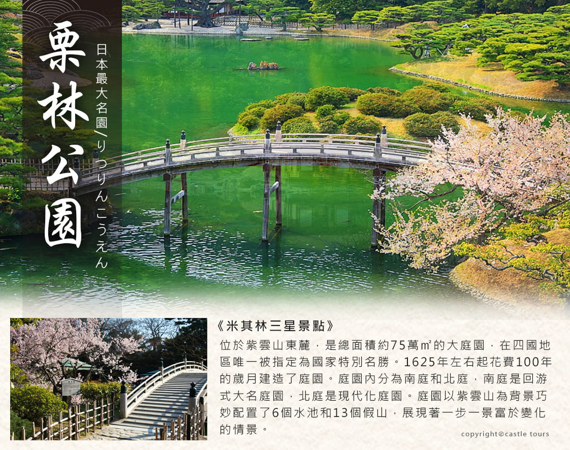 位於紫雲山東麓,是總面積約75萬㎡的大庭園,在四國地區唯一被指定為國家特別名勝。1625年左右起花費100年的歲月建造了庭園。庭園內分為南庭和北庭,南庭是回游式大名庭園,北 庭是現代化庭園。庭園以紫雲山為背景巧妙配置了6個水池和13個假山,展現著一步一景富於變化的情景。以黑松為主,還有多彩的樹木、春季的櫻花、初夏的蓮花和菖蒲、冬季的山茶等,不同的季節和時間有不同的韻味,可以觀賞各個時節的美景。南湖上架設著弧度優美的偃月橋,從東端的假山飛來峰眺望的、借景濃綠紫雲山的南湖、偃月橋和3島美景是栗林公園的代表性風景。