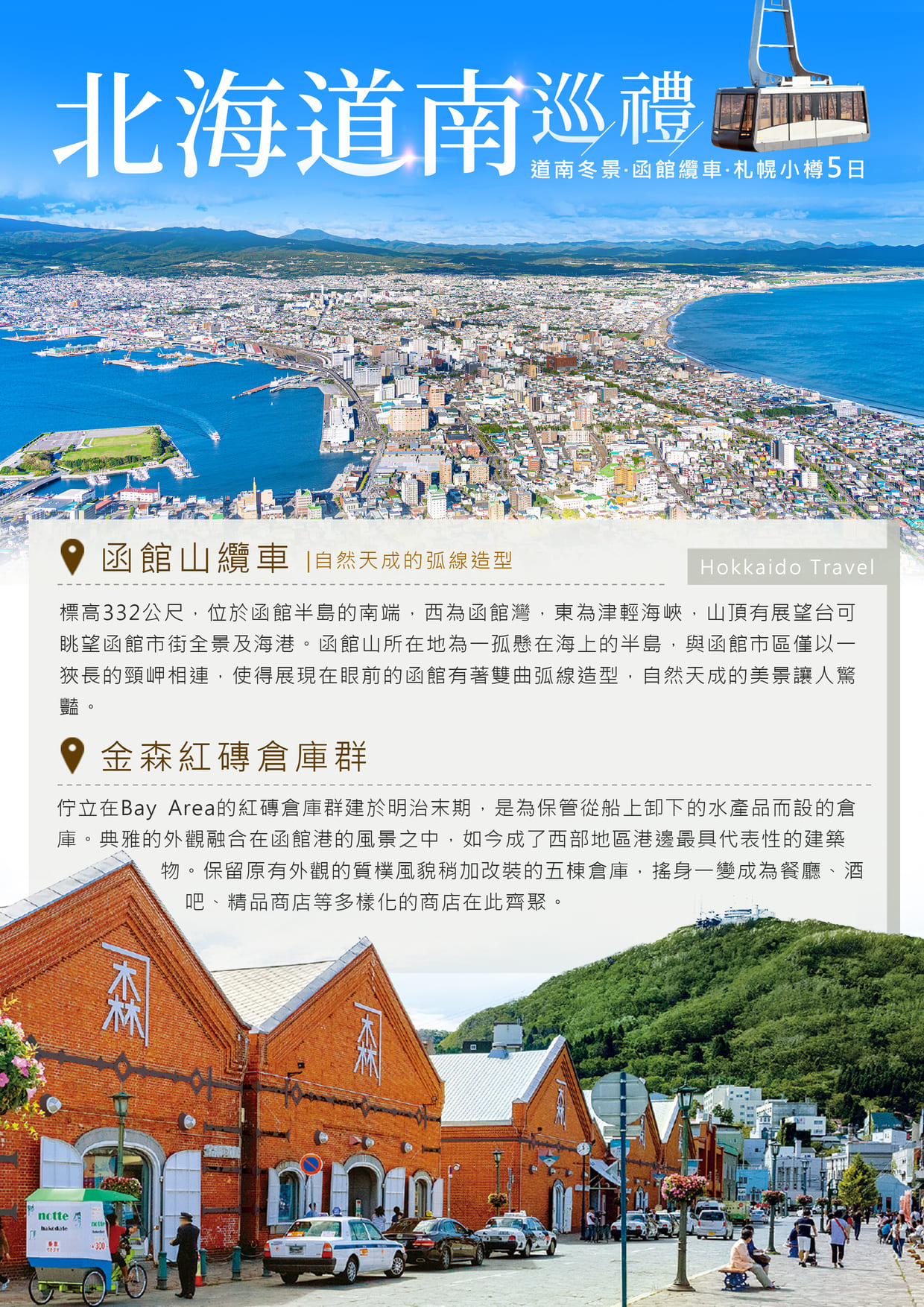 * 如遇函館山纜車維修或天氣因素而無法搭乘,則搭遊覽車上下山,每人退費1,500日幣,敬請見諒。