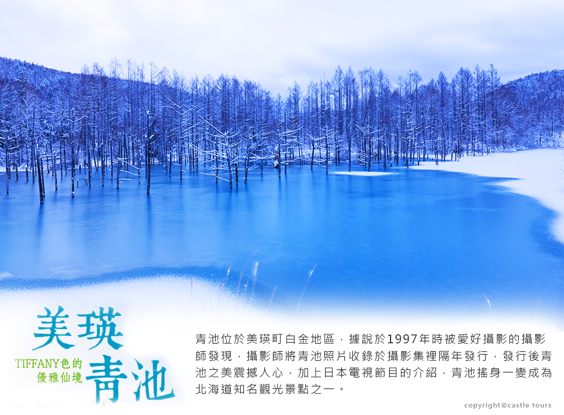 位在美瑛町的東南部,地處美瑛川左岸,景色優美,仿以人間仙境。青池面積不是很大,周邊有步行道,兩旁種滿樹林,晴天時樹影倒映在藍色水面上,恰似一幅濃淡不一的油畫。青池有時仿如一個溫婉的姑娘靜而不動,無言佇立令人疼惜,時而又像頑皮的少男,在陽光照射下顏色變幻莫測。