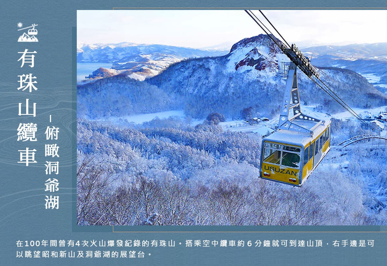 有珠山空中纜車位於北海道虻田郡的昭和新山,搭乘纜車登上山頂只需6分鐘,能享受一段空中觀光之旅,欣賞洞爺湖、羊蹄山與內浦灣的景致。山頂上的洞爺湖展望台,可以欣賞與洞爺湖鄰接的昭和新山全景。此外,沿著步道前往火口原展望台,還能近距離觀看持續冒煙的銀沼火山口和小有珠山。