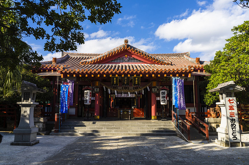 琉球八神社之一,矗立在珊瑚礁岩上,俯視那霸港,視野遼闊。神社中供奉國土守護神,重大祭祀都在此舉行,吸引無數的琉球人民及觀光客至此許願納福,祈求平安。