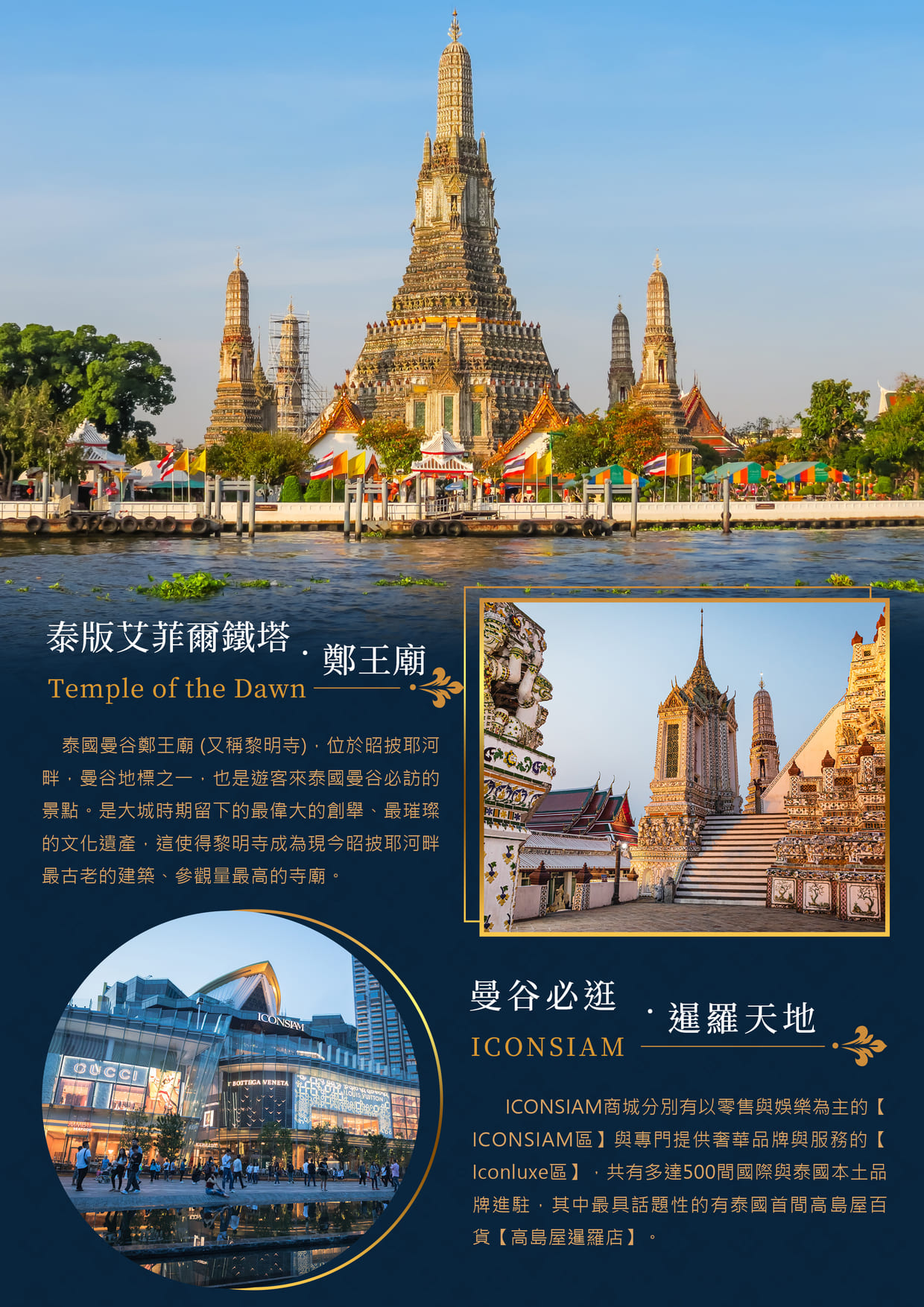 ◆ICONSIAM暹羅天地:ICONSIAM河岸綜合購物商城分別有以零售與娛樂為主的【ICONSIAM區】與專門提供奢華品牌與服務的【Iconluxe區】,共有多達500間國際與泰國本土品牌進駐,14個國際品牌將在此設立旗艦店,其中最具話題性的有泰國首間高島屋百貨【高島屋暹羅店】。除了頂級的購物與美食體驗,曼谷ICONSIAM河岸綜合購物商城還設置了室內水上市集與【ICONSIAM文物博物館】,讓遊客在逛街購物的同時,體驗泰國道地的文化與藝術風采。