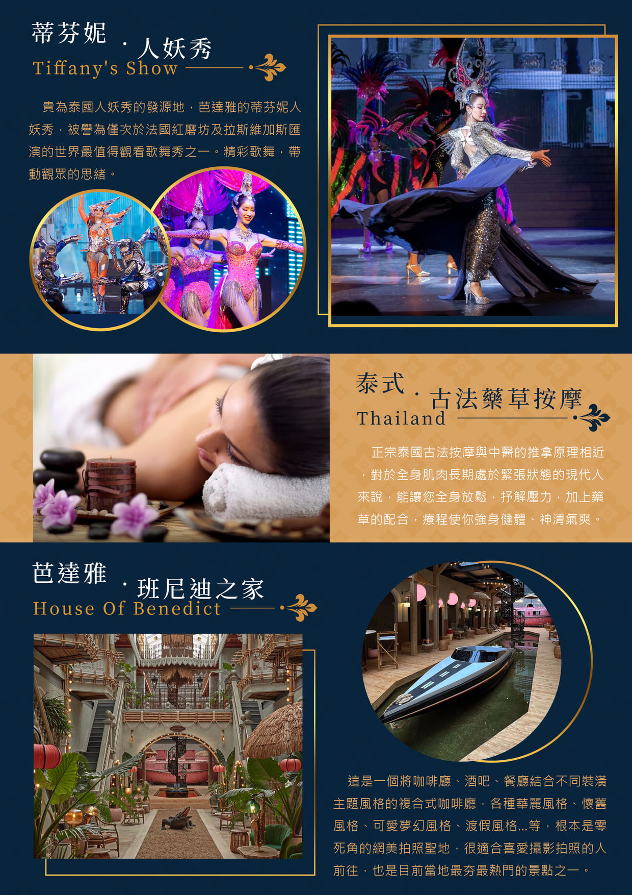 ◆蒂芬妮人妖秀(VIP座位席):貴為泰國人妖秀的發源地,芭達雅的蒂芬妮人妖秀,被譽為僅次於法國紅磨坊及拉斯維加斯匯演的世界最值得觀看歌舞秀之一。於1974年的新年前夕,幾個「她」興之所至,為一幫朋友落力表演了一場,卻深得大家喜愛,持續擴大規模至今,成為泰國最受歡迎的歌舞匯演。而他們的精彩歌舞,更能帶動觀眾的思緒,隨著節奏與歌者的情感而起伏。如果嫌遠看看不清真偽,完場後,舞者們會到台前跟大家拍照留念,讓你近距離感受他們的華麗風采。