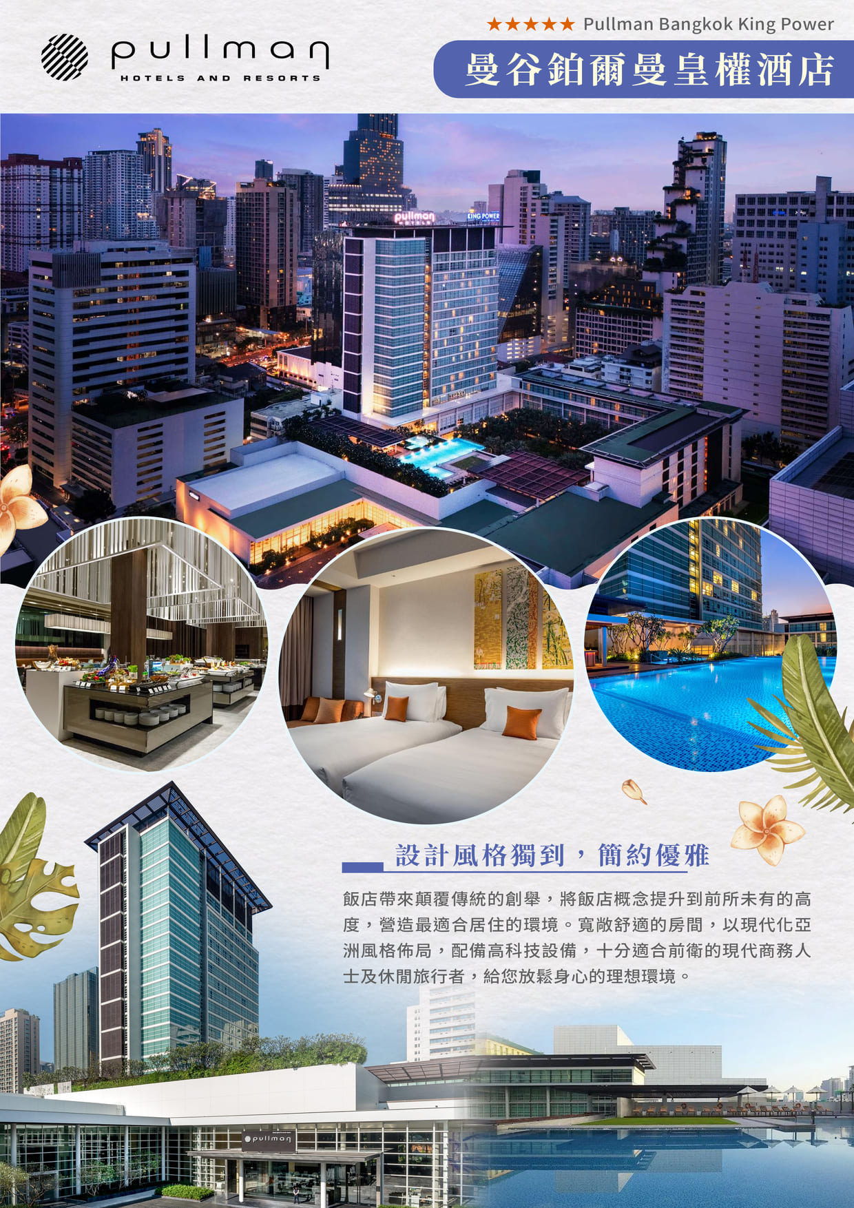住宿:曼谷★★★★★Pullman Bangkok King Power 或 或Grande Centre Point Sukhumvit 55 或 或Sindhorn Midtown 或同等級